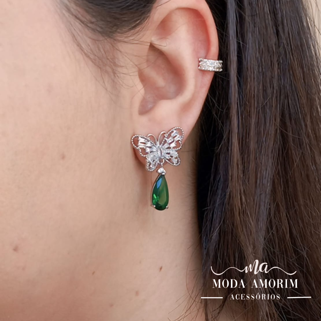 Brinco Borboleta Cristal Verde - Folheado Prata 925